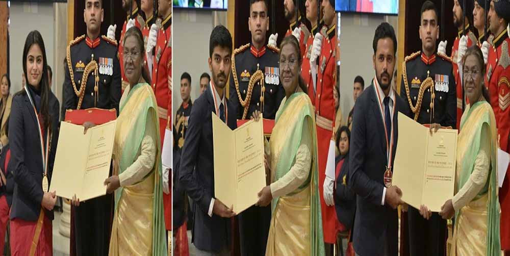 दो ओलंपिक पदक जीतने वाली निशानेबाज मनु भाकर और शतरंज वर्ल्ड चैंपियन डी गुकेश शुक्रवार को राष्ट्रीय खेल पुरस्कार समारोह में राष्ट्रपति द्रौपदी मुर्मू से जब मेजर ध्यानचंद खेलरत्न सम्मान लेने पहुंचे तो तालियों की गड़गड़ाहट के साथ उनका स्वागत किया गया। इनके अलावा भारतीय पुरूष हॉकी टीम के कप्तान हरमनप्रीत सिंह और पैरालम्पिक गोलड मेडलिस्ट हाई जंप के खिलाड़ी प्रवीण कुमार को भी देश का सर्वोच्च खेल सम्मान यहां राष्ट्रपति भवन में प्रदान किया गया।
