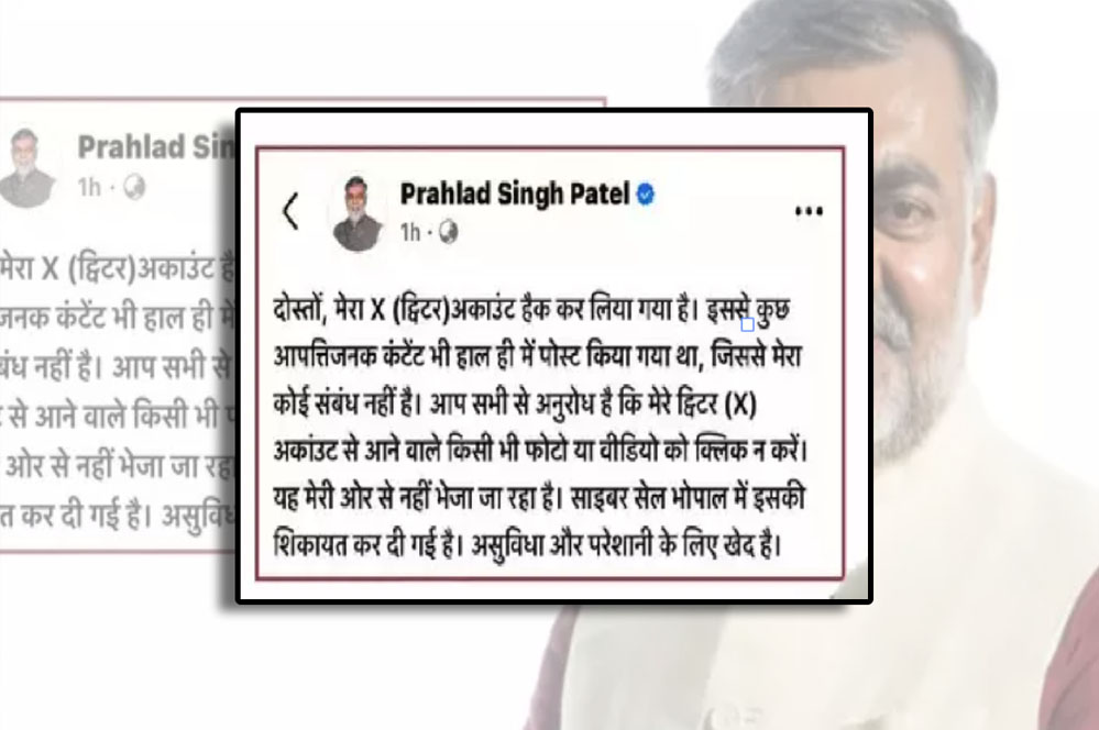 मध्यप्रदेश से हैरान करने वाला मामला सामने आया है।यहां प्रदेश के पंचायत एवं ग्रामीण विकास मंत्री प्रह्लाद सिंह पटेल का एक्स अकाउंट हैक हो गया है। हैकर्स ने कांग्रेस संबंधी आपत्तिजनक सामग्री पोस्ट की है। मंत्री ने साइबर सेल में शिकायत दर्ज कराई है और जनता से सावधान रहने की अपील की है।