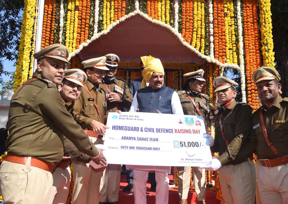 मुख्यमंत्री डॉ. यादव ने ‘मुख्यमंत्री अदम्य साहसिक कार्य पुरस्कार’ की घोषणा की, जिसके अंतर्गत कठिन परिस्थितियों में जान-माल की रक्षा करने वाली 10 रेस्क्यू टीमों को प्रतिवर्ष 51 हजार रुपये दिए जाएंगे। इसके अंतर्गत इन्दौर, शिवपुरी, गुना, रायसेन, मंडला, नरसिंहपुर, रीवा, छतरपुर, टीकमगढ़ और उज्जैन की रेस्क्यू टीमों को सम्मानित किया गया। उन्होंने तीन वर्ष में मिलने वाले दो माह के बाध्य काल ऑफ को समाप्त करने और प्रतिवर्ष मिलने वाली अनुकंपा अनुदान राशि 360 रुपये को बढ़ाने की घोषणा की। उन्होंने कहा कि उज्जैन स्थित महाकाल ज्योर्तिलिंग एवं महाकाल लोक की व्यवस्था के लिए होमगार्ड के 488 पदों की स्वीकृति दी गई है। प्रदेश के प्रमुख मंदिरों और महत्वपूर्ण स्थलों की सुरक्षा के लिए भी आवश्यक बल उपलब्ध कराया जाएगा। नए जिलों में आवश्यकता के अनुरूप अतिरिक्त पद सृजित किए जाएंगे। आपदा प्रबंधन में त्वरित कार्रवाई की आवश्यकता को देखते हुए बल के अधिकारियों और जवानों को कार्यस्थल के निकट आवासीय सुविधा उपलब्ध कराने के लिए आपदा प्रबंधक क्षमता को किया जा रहा है सशक्त की योजनाओं, पीपीपी मॉडल और पुनर्घनत्वीकरण योजना के अंतर्गत स्थाई आवास की व्यवस्था की जाएगी।