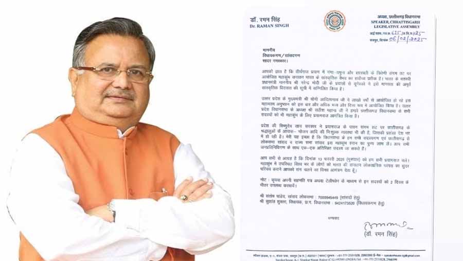 विधानसभा अध्यक्ष डॉ. रमन सिंह ने प्रदेश के विधायकों और सांसदों को महाकुंभ में स्नान के लिए 13 फरवरी को प्रयागराज चलने का आमंत्रण दिया है. यात्रा के लिए सांसद संतोष पांडेय और विधायक सुशांत शुक्ला से संपर्क करने को कहा गया है.