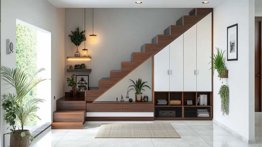 सीढ़ियों के नीचे की जगह को खाली छोड़ देना बेहतर होगा। हालांकि, यदि आप उस जगह का इस्तेमाल करना चाहते हैं, तो उसे स्टोर रूम की तरह इस्तेमाल कर सकते हैं। इसके अलावा उस जगह का इस्तेमाल आप जूते रखने का रैक के रूप में भी कर सकते हैं।
