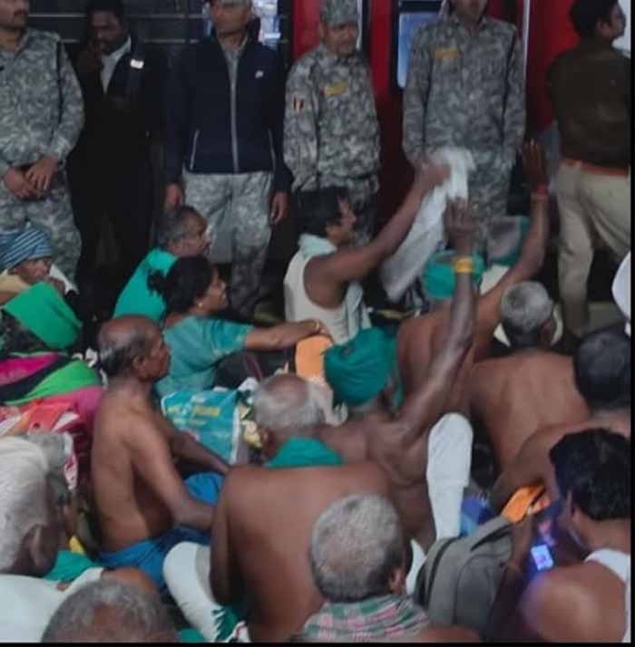 ट्रेन से उतारे जाने के विरोध में किसानों ने रेलवे स्टेशन पर अर्द्धनग्न होकर प्रदर्शन किया। साथ ही तमिल भाषा में जमकर नारेबाजी की। प्रदर्शनकारी किसानों में पुरुषों के साथ बुजुर्ग, महिलाएं भी शामिल थीं। प्रदर्शनकारी किसानों को उतारने के साथ ही प्रशासन अब उन्हें वापस करने का इंतजाम कर रहा है। वर्तमान में शहर के एक निजी गार्डन में किसानों के भोजन की व्यवस्था की जा रही है।