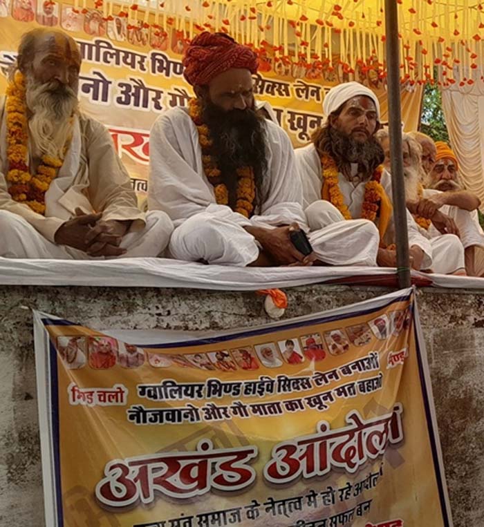 हाइवे को सिक्सलेन बनाने, गो अभ्यारण की मांग को लेकर शहर के खंडा रोड पर संतों का अखंड आंदोलन छठवें दिन भी जारी रहा। इस मांग को लेकर आठ संतों की भूख हड़ताल दूसरे दिन भी जारी रही। वहीं अन्न त्यागकर धरने पर बैठे संत प्रेमदास महाराज गोहद की अचानक से तबीयत बिगड़ गई। उन्हें उपचार के लिए जिला अस्पताल में भर्ती कराया गया। चिकित्सकों का कहना था कि संत का बीपी बढ़ा हुआ है। अखंड आंदोलन के छठवें दिन कांग्रेस के उपनेता प्रतिपक्ष एवं अटेर विधायक हेमंत कटारे मंगलवार को कांग्रेसी कार्यकर्ताओं के साथ आंदोलन स्थल पर पहुंचे। उन्होंने संतों के समक्ष हाथ जोड़कर प्रार्थना करते हुए भूख हड़ताल खत्म करने का आग्रह किया।