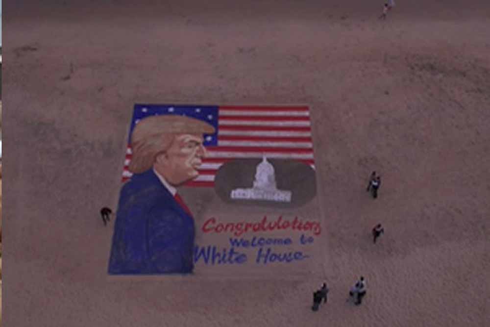 ओडिशा के पुरी बीच पर प्रसिद्ध सैंड आर्टिस्ट सुदर्शन पटनायक ने अमेरिका के नवनिर्वाचित राष्ट्रपति डोनाल्ड ट्रंप के शपथ ग्रहण समारोह से पहले उनकी 47 फीट लंबी सैंड आर्ट बनाई है। इस चित्र पर उन्होंने लिखा "वेलकम टू व्हाइट हाउस"। यह सैंड आर्ट पटनायक ने अपने सैंड आर्ट संस्थान के छात्रों के साथ मिलकर तैयार किया है। ट्रंप सोमवार, 20 जनवरी को अमेरिकी राष्ट्रपति के रूप में शपथ लेंगे। यह चार साल के अंतराल के बाद व्हाइट हाउस में उनकी वापसी होगी। सुदर्शन पटनायक की यह कला अमेरिका के शपथ ग्रहण समारोह से पहले एक महत्वपूर्ण संदेश देती है।