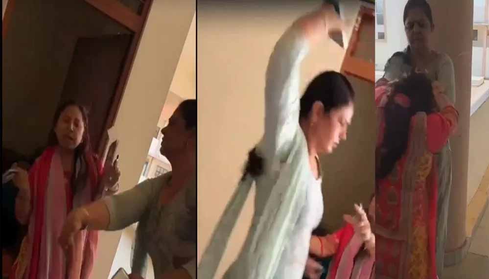 वीडियो में पीछे से एक लड़का कहता हुआ सुनाई देता है, 'मम्मा, रहने दो।' कोई भी बीच-बचाव नहीं करता है, जब तक कि एक महिला शांति से दोनों लड़ रही महिलाओं को पीछे हटने के लिए नहीं कहती।