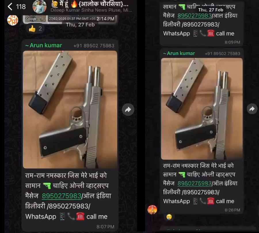 सूत्रों के मुताबिक, इस अवैध धंधे में अरुण कुमार और राहुल कुमार नाम के दो व्यक्ति मुख्य आरोपी हैं। ये लोग व्हाट्सएप ग्रुप में हथियारों की तस्वीरें शेयर कर खरीदारों को लुभा रहे हैं। ग्रुप में जारी एक मैसेज में लिखा गया—”जिस किसी भाई को सामान चाहिए, वह 8950****** नंबर पर संपर्क करे। ऑल इंडिया डिलीवरी उपलब्ध है।”
