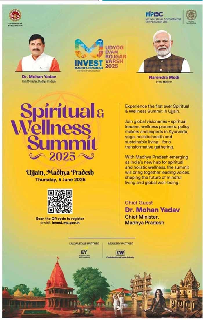 मुख्यमंत्री डॉ. मोहन यादव की गरिमामय उपस्थिति में औद्योगिक नीति एवं निवेश प्रोत्साहन विभाग द्वारा 5 जून को उज्जैन में 'स्पिरिचुअल एंड वेलनेस समिट' का आयोजन किया जायेगा। इस समिट का उद्देश्य मध्यप्रदेश को वैश्विक वेलनेस हब के रूप में स्थापित करना तथा उज्जैन को वेलनेस सेक्टर की प्रमुख केंद्रस्थली के रूप में अंतरराष्ट्रीय पहचान दिलाना है। इस आयोजन के माध्यम से योग, आयुर्वेद, प्राकृतिक चिकित्सा, जनजागरूकता, आध्यात्मिकता तथा वेलनेस आधारित उद्योगों में निवेश और सहयोग को प्रोत्साहित करने पर विशेष ध्यान केंद्रित किया जाएगा।