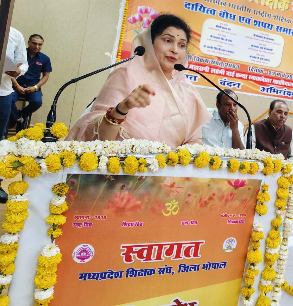 पिछड़ा वर्ग एवं अल्पसंख्यक कल्याण राज्य मंत्री (स्वतंत्र प्रभार) श्रीमती कृष्णा गौर ने कहा कि शिक्षक समाज का संस्कृति के सरंक्षण और संवर्धन में महत्वपूर्ण योगदान है । शिक्षकों के प्रयास से एक ऐसी पीढ़ी का निर्माण हो, जिसमें राष्ट्रभक्ति की भावना प्रबल हो और जो राष्ट्र के उज्ज्वल भविष्य का आधार बने। राज्य मंत्री श्रीमती गौर महारानी लक्ष्मी बाई कन्या महाविद्यालय भोपाल में मध्यप्रदेश शिक्षण संघ द्वारा आयोजित दायित्व बोध/ शपथ समारोह को संबोधित कर रही थी। राज्य मंत्री श्रीमती गौर ने कहा कि मध्यप्रदेश शिक्षक संघ बीते 55 वर्षों से पूर्ण समर्पण के साथ राष्ट्र हित, शिक्षा हित, शिक्षक हित और छात्र हित में सतत कार्यरत है।