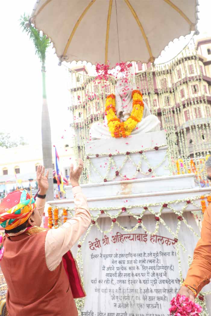 इंदौर के राजवाड़ा में आयोजित मंत्रि-परिषद की महत्वपूर्ण बैठक का शुभारंभ लोकमाता देवी अहिल्या बाई होल्कर के नमन के साथ किया गया। मुख्यमंत्री डॉ. मोहन यादव ने राजवाड़ा के समीप स्थित उद्यान में देवी अहिल्या बाई होल्कर की प्रतिमा पर पुष्पांजलि अर्पित की। उप मुख्यमंत्री श्री राजेन्द्र शुक्ल तथा श्री जगदीश देवड़ा सहित मंत्रीगण श्री प्रहलाद सिंह पटेल, श्री राकेश सिंह, श्री कैलाश विजयवर्गीय, श्री तुलसीराम सिलावट और अन्य मंत्रीगणों ने भी पुष्पांजलि अर्पित की। मुख्यमंत्री डॉ. यादव सहित मंत्रि-परिषद के सदस्यों का मालवी परम्परा के अनुरूप पगड़ी पहनाकर स्वागत-सत्कार किया गया। मुख्यमंत्री डॉ. यादव और मंत्रीगणों ने इस स्मृति को चिर स्थायी बनाये रखने के लिये सामूहिक फोटो भी खिंचवाये।