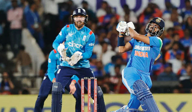 10वें ओवर में यशस्वी जायसवाल ने राणा की गेंद पर मिडविकेट से पीछे की ओर 21 मीटर दौड़ते हुए डकेट (32) का शानदार कैच लपका। राणा ने दो गेंद बाद हैरी ब्रूक (0) को भी राहुल के हाथों कैच करा दिया। दो रनों के भीतर ये तीनों विकेट गिरे। 19 रन बनाने वाले जो रूट को आउट कर रविंद्र जडेजा ने इंग्लैंड को सबसे बड़ा झटका दिया। इसके बाद बटलर ने बेथेल के साथ 59 रन की साझेदारी की। अर्धशतक बनाने के बाद वह अक्षर की गेंद को हवा में खेलकर हार्दिक पंड्या को कैच दे बैठे। उन्होंने 67 गेंद की अपनी 52 रनों की पारी में चार चौके मारे।