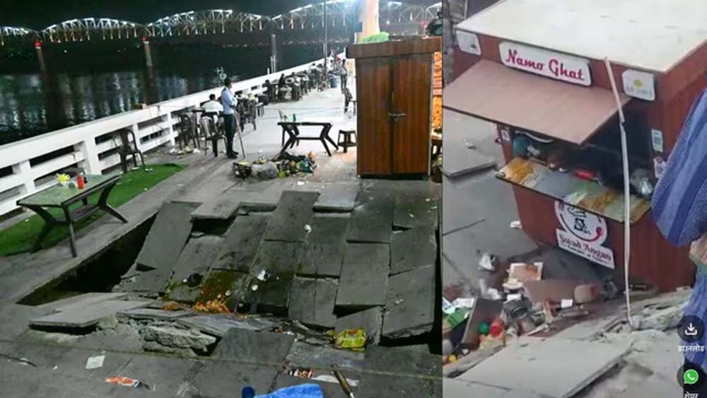 वाराणसी के प्रसिद्ध नमो घाट पर अचानक जमीन धंसी, जमीन के साथ ही दुकानें भी एक तरफ लुढ़क गईं