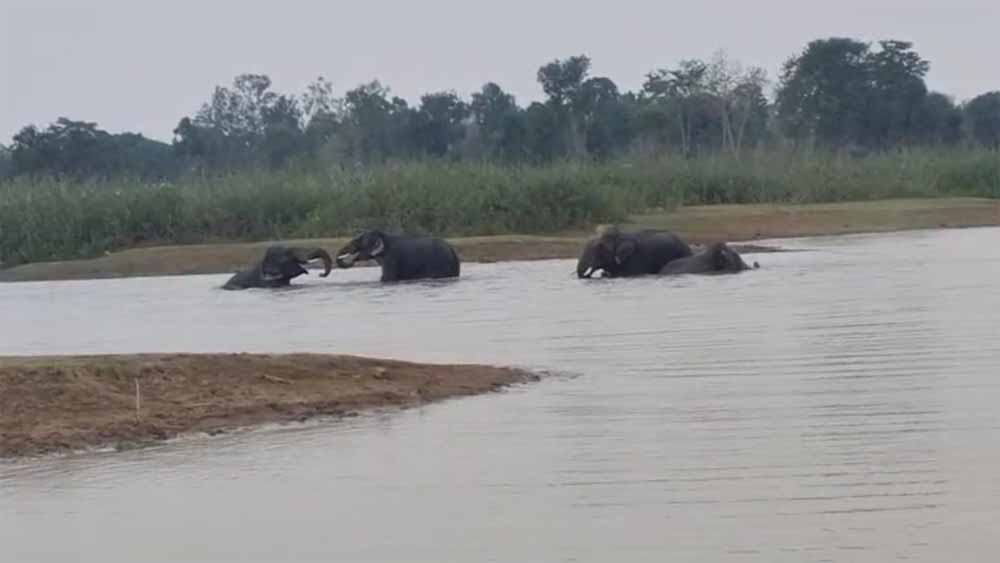 मरवाही वनमंडल के जंगलों में तलाब में अठखेलियां करते नजर आया हाथियों का दल