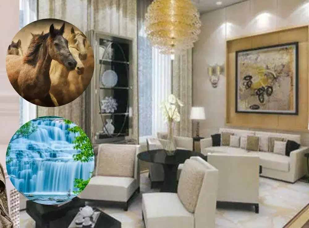 बैठक: उगते हुए सूरज की तस्वीर, दौड़ते हुए सात सफेद घोड़ों की तस्वीर (तरक्की के लिए), या हरे-भरे जंगल के दृश्य लगाएं। यहां युद्ध, जंगली जानवरों, या उदासी वाली पेंटिंग्स न लगाएं।