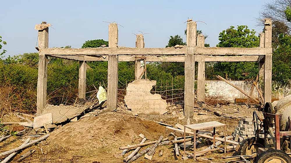 घटिया निर्माण सामग्री से निर्माणाधीन श्मशान घाट का शेड हुआ धराशायी