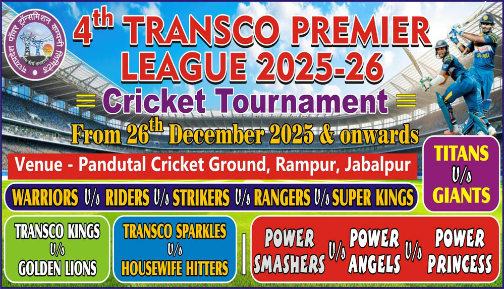 एम.पी. ट्रांसको (मध्यप्रदेश पावर ट्रांसमिशन कंपनी) मुख्यालय, जबलपुर में अंतरविभागीय वार्षिक खेलकूद प्रतियोगिता के अंतर्गत “ट्रांसको प्रीमियर क्रिकेट लीग–2025-26” का आयोजन 26 दिसम्बर 2025 से किया जा रहा है।प्रतियोगिता के संयोजक कार्यपालन अभियंता श्री इकबाल खान ने बताया कि टेनिस बॉल से खेली जाने वाली इस प्रतियोगिता के सभी लीग एवं फाइनल मुकाबले रामपुर स्थित पांडुताल खेल प्रांगण में आयोजित किए जाएंगे।