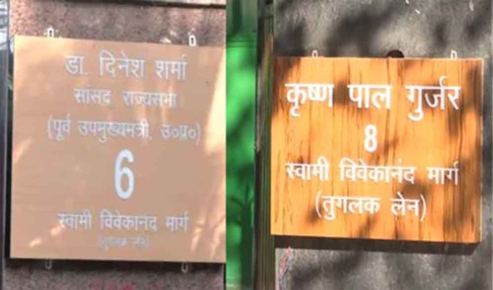 केंद्रीय मंत्री कृष्ण पाल गुर्जर को सरकारी आवास दिल्ली के तुगलक लेन में मिला है, लेकिन उन्होंने घर पर लगी नेमप्लेट में स्वामी विवेकानंद मार्ग लिखवा लिया है। शुक्रवार को यह बदलाव किया गया, जिसमें उनके घर का पता तुगलक लेन नहीं बल्कि स्वामी विवेकानंद मार्ग बताया गया है। उनके अलावा भाजपा के एक अन्य सांसद दिनेश शर्मा ने भी ऐसा ही किया है। उन्होंने इसकी जानकारी गुरुवार को एक्स पर दी थी। उन्होंने एक्स पर लिखा, 'आज नई दिल्ली स्थित नए आवास स्वामी विवेकानंद मार्ग (तुगलक लेन) में सपरिवार विधि विधानपूर्वक, पूजन-अर्चन कर गृह प्रवेश किया।' इसके साथ ही उन्होंने तस्वीरें भी शेयर की हैं, जिसमें से एक में पते के तौर पर स्वामी विवेकानंद मार्ग लिखा दिखता है।