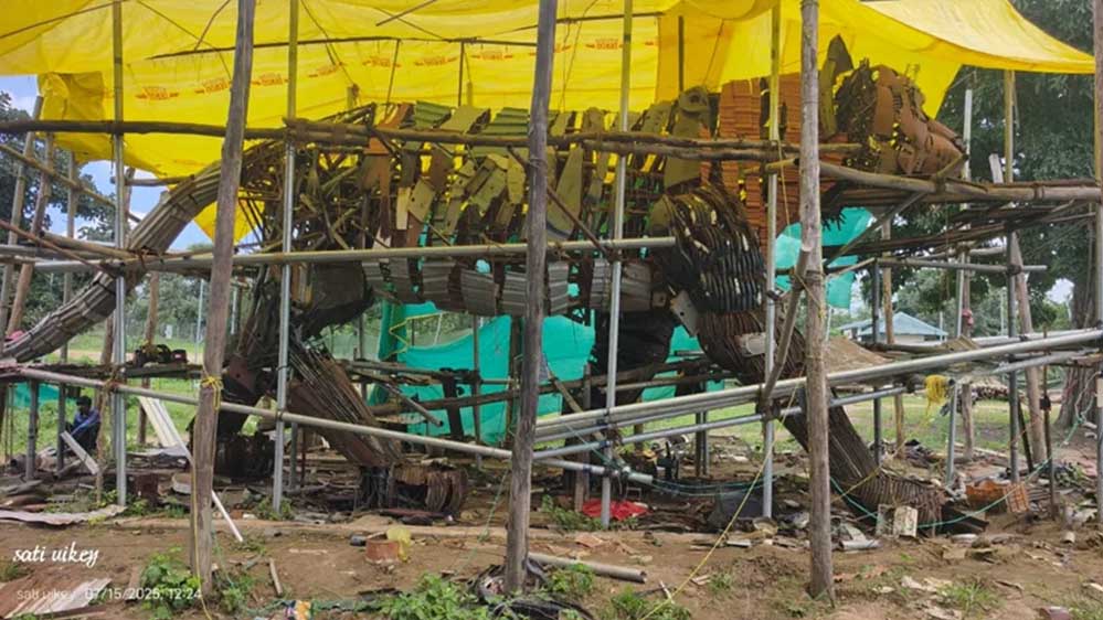 जनवरी माह में लोहे के अनुपयोगी सामग्रियों जैसे पुरानी साईकिल, पाइप, जंग लगी लोहे की चादरें आदि विविधतापूर्ण सामग्रियों से प्रतिमा का निर्माण प्रारंभ किया गया था, जो अब वह लगभग अपनी पूर्णता पर है।